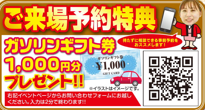 ご来場予約いただいた方に、ガソリン券1,000円分をプレゼントいたします✨