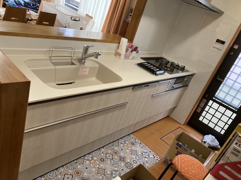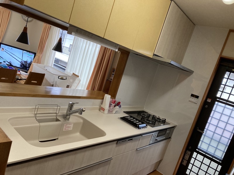 既存吊戸や背面収納とマッチしてシンプルながら使い勝手の良い新しいキッチン