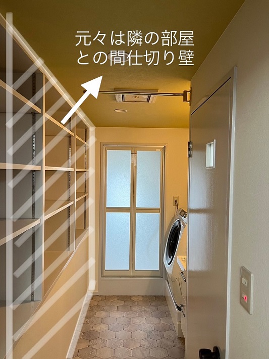 洗面所の収納がなく、お風呂、洗面台、洗濯、トイレで使う日用品やストック品、またタオルや下着類など使用頻度の高いものもなかなか収納にお困りの様子でした。左の壁は隣の和室との間仕切り壁でしたが、収納を確保するために思い切って壁の位置をずらしました!!