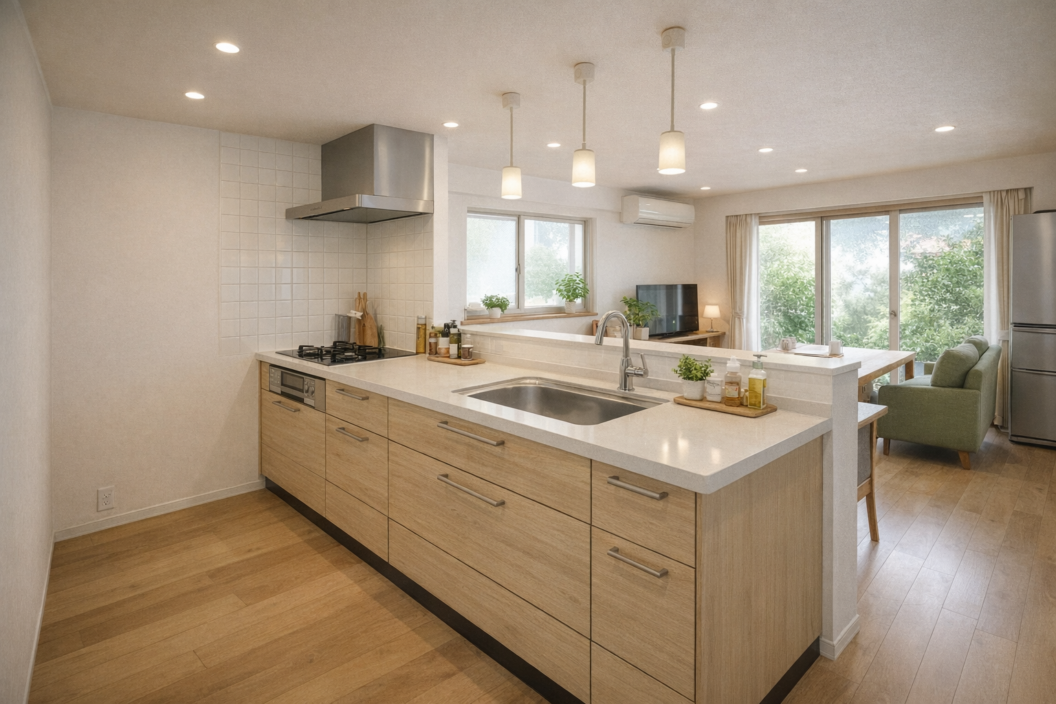 壁付けキッチンから対面キッチンへ変更し、リビング側からの光を取り込めるレイアウトをご提案。